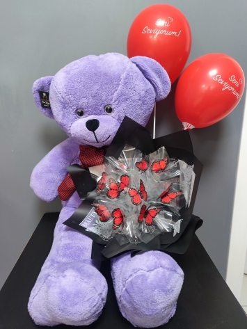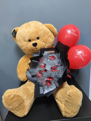 100 CM PELUS AYI VE BALONLI ISIKLI KELEBEK BUKET Tasarım 'da kullanılan çiçek ve aksesuarlar stok durumuna göre farklılık gösterilebilir.