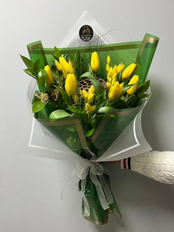 SARI LALE BUKETİ Tasarım 'da kullanılan çiçek ve aksesuarlar stok durumuna göre farklılık gösterilebilir.