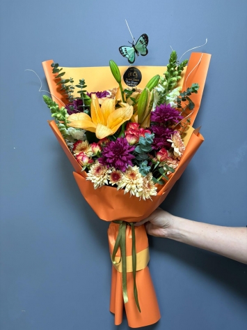 TURUNCU LİLYUM İTHAL ÇARDAK GÜLLÜ KASIMPATI BUKETİ Tasarım 'da kullanılan çiçek ve aksesuarlar stok durumuna göre farklılık gösterilebilir.